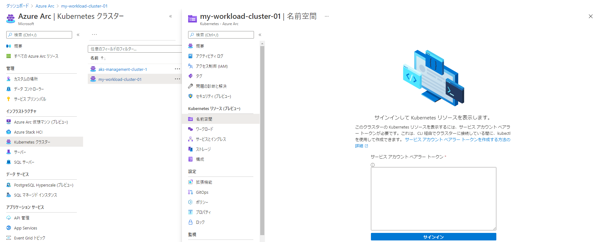 事前準備として、kubectl のインストール、kube-configの配置を実施 - Azure Portal のにトークンを貼り付けた後は、こうなった